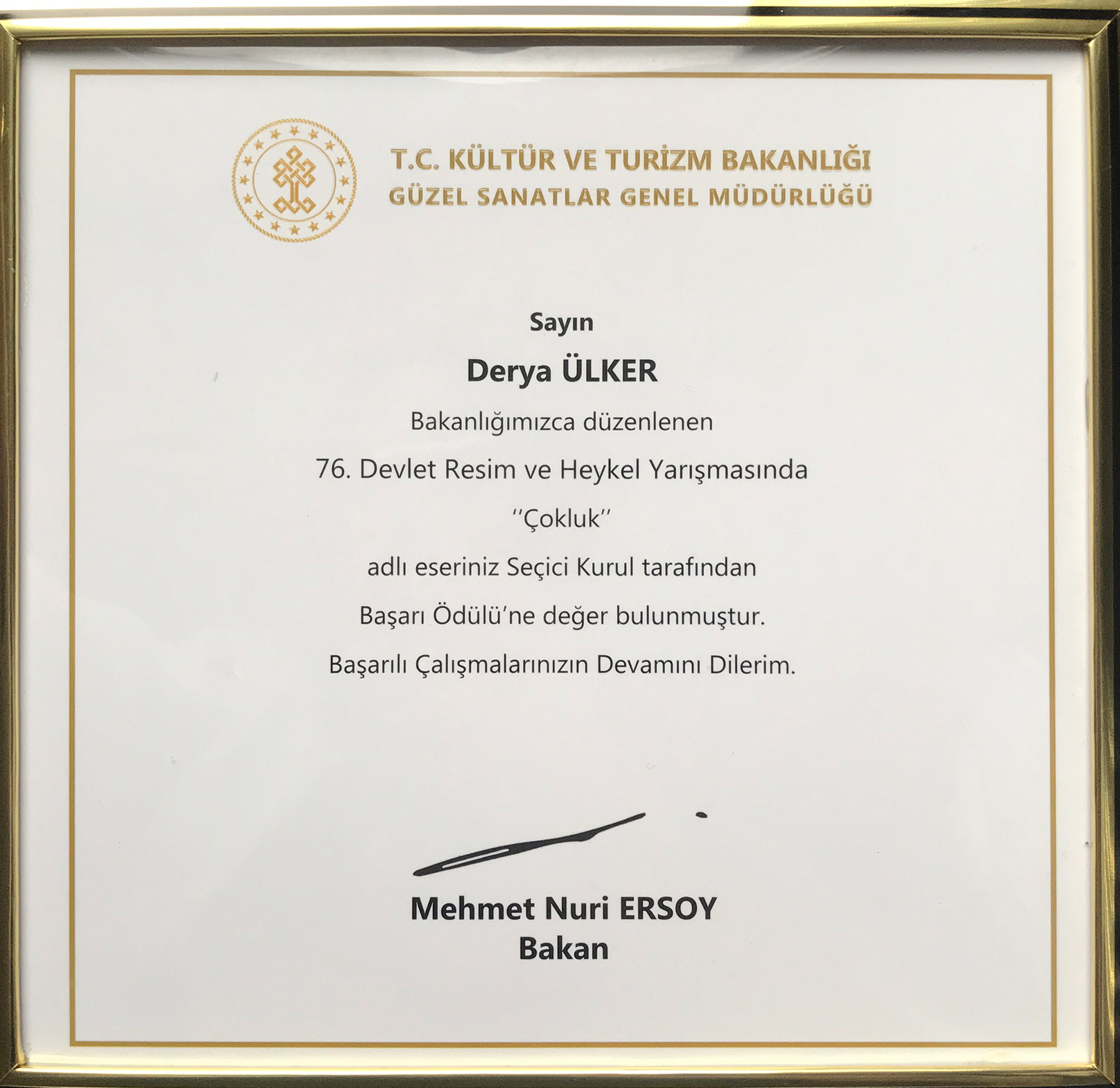2023 yılında, Cumhuriyetimizin 100. Yılına ithafen yoğun bir katılımla gerçekleştirilen 76. Devlet Resim ve Heykel Yarışması Resim dalında Başarı Ödülüne layık görülen 116x140 cm. ölçülerindeki resmim: Çokluk / Multitude (2023)